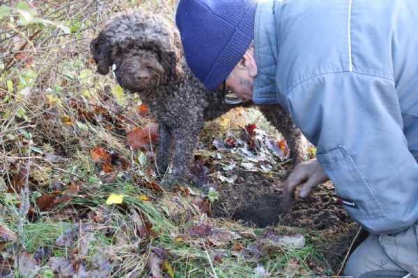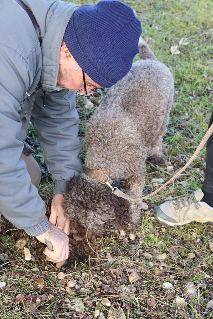 Le chien, dressé à identifier l’odeur d’une truffe arrivée à maturité, parcourt la truffière.